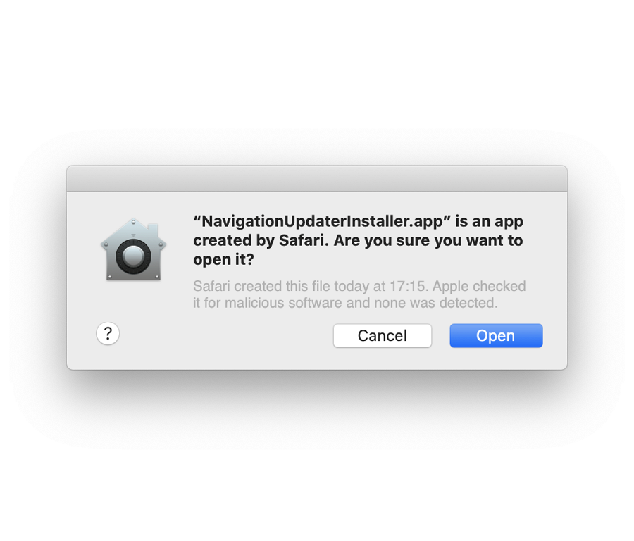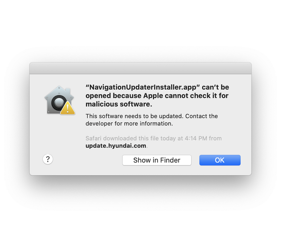 “Can't be opened because Apple cannot check it for malicious software.” message may pop-up when installing Navigation Updater.
