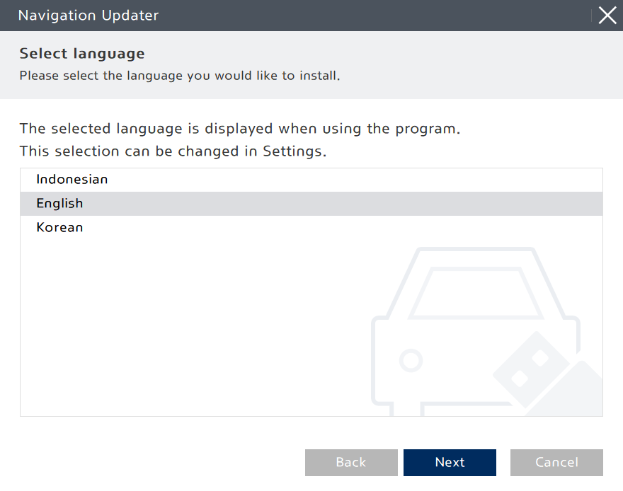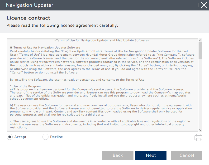 Before installing Navigation Updater, please review and accept the License Contract terms and Navigation software license terms, then click the "Next" button.