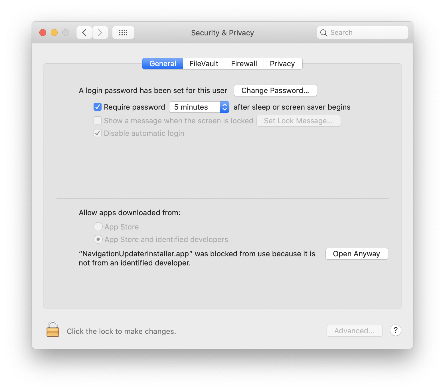 “Can't be opened because Apple cannot check for malicious software.”  message may pop-up when installing Navigation Updater.