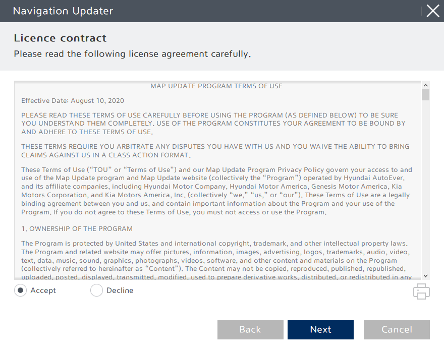 Before installing Navigation Updater, please review and  accept  the  License Contract terms and Navigation software license terms, then click the "Next" button.